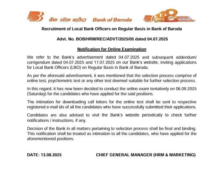 Bank Of Baroda (BOB), has recently announced the Bank Of Baroda LBO Result 2025. The online registration window was open from 04 July 2025 to 03 August 2025. Eligible candidates submitted their online application within this period. Candidates were advised to carefully read the Official Notification PDF of the Bank Of Baroda LBO Recruitment 2025.