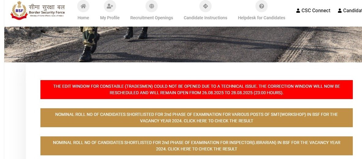 • BSF Constable Tradesman Recruitment 2025 Notification has been released, all interested candidates can Apply online from 25/07/2025 to 23/08/2025.