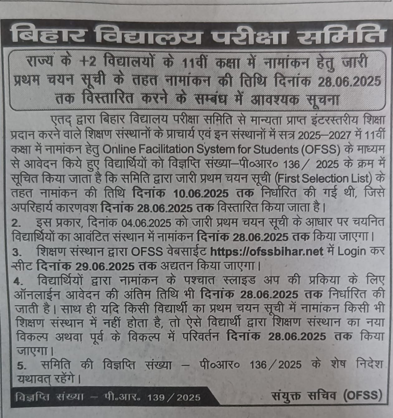• OFSS Bihar 11th Merit List Admission 2025 Notification has been released, all interested candidates can Apply online from 24/04/2025 to 03/05/2025.